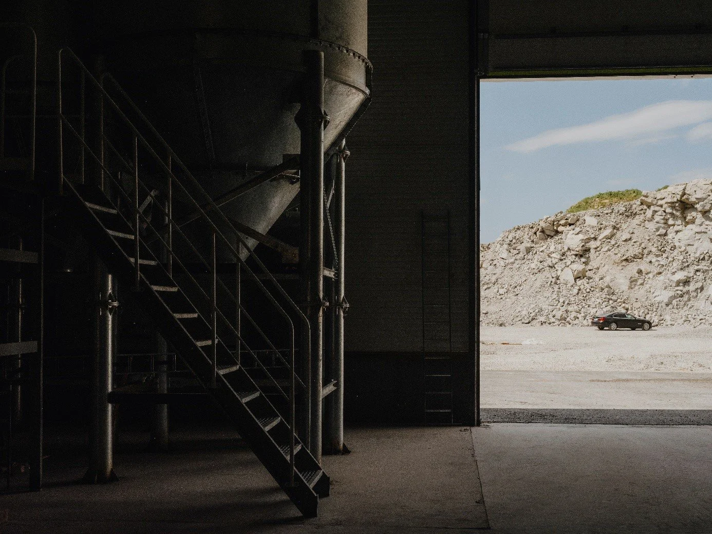 Fabrikken til Cemonite sett innenifra, den er utstyrt med en mølle og miksestasjon som kan male ned mineralske og ikke mineralske masser fra grov grus til fint sementpulver.